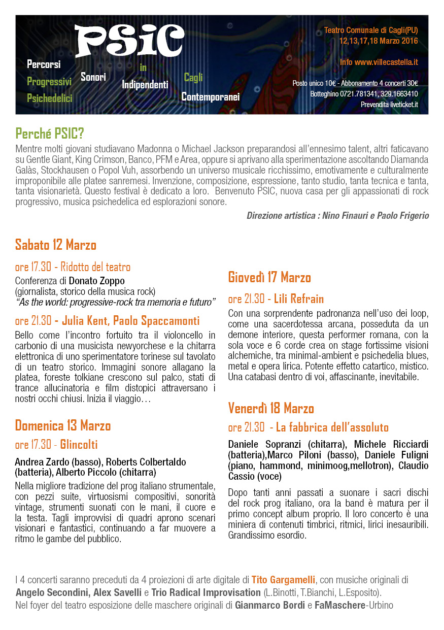 Durante le 4 serate di programmazione dei concerti, nel foyer del teatro sarà allestita una mostra di opere d’arte e maschere realizzate da Gianmarco Bordi e FaMaschere, utilizzate poi nelle visionarie creazioni fotografiche di Tito Gargamelli, le quali saranno proiettate in sala prima dell’inizio dei concerti stessi, con le particolari colonne sonore di altrettanti artisti sperimentatori e ricercatori di sonorità, quali Angelo Secondini, Alex Savelli e il trio Radical Improvvisation di Binotti, Bianchi e Esposito. Insomma ogni serata tanti stimoli diversi. Trovando la giusta sponda in Sandro Pascucci, direttore del Teatro di Cagli, e nella collaborazione con l’amministrazione comunale e provinciale, ecco a voi quindi PSIC, festival nuovo di zecca, nuova casa per gli appassionati di rock progressivo, musica psichedelica e sperimentazioni sonore.