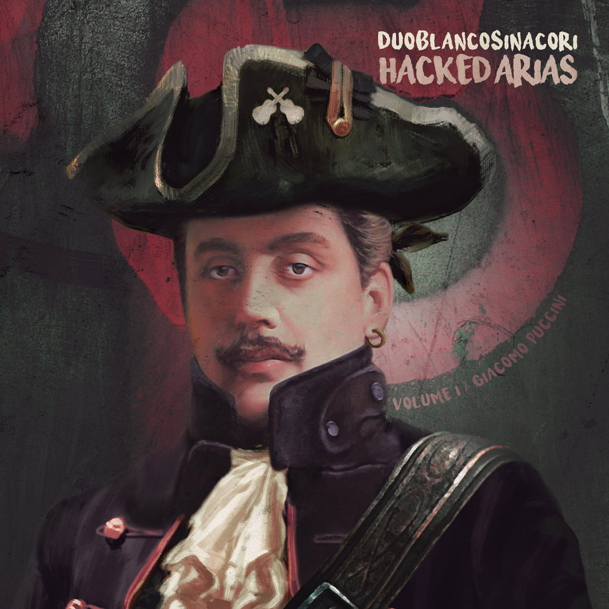 È assai importante anche il lavoro grafico e concettuale realizzato da Antonio Cusimano – visual artist noto come 3112htm – intorno alla figura di Puccini per realizzare la copertina di Hacked Arias, ancora una volta un piccolo gioiello visivo nella ormai storica tradizione Almendra, sempre attenta al rapporto tra memoria e futuro, tra identità e pluralità di segni e stimoli, con il dichiarato omaggio al movimento artistico degli Anacronisti: «Lo scopo prefissato era quello di “hackerare” Giacomo Puccini con elementi che lo rendessero avulso dal proprio contesto temporale, al fine di creare un contrasto con la sua figura sedimentata nell’immaginario collettivo. L’artwork crea dunque, con espedienti anacronistici, un’immagine del compositore paradossalmente “fedele” e diversa a un tempo da quella universalmente conosciuta, una versione distopica e immaginifica che mischia elementi distanti fra loro nel tempo. La composizione muove infatti dalla ritrattistica del XIX secolo, che ancora permaneva in Italia in pieno XX secolo, e vede Puccini ritratto a mezzo busto come da tradizione, ma sullo sfondo di un muro di periferia di oggi con scritte e tag di writers che diventano la tracklist dell’album, e nelle vesti di un bucaniere come nei ritratti dei capitani nell’epoca d’oro della pirateria, con l’effige del Duo Blanco Sinacori sul tricorno: un “Jolly Roger” in cui le chitarre sostituiscono il tradizionale teschio con le tibie incrociate».