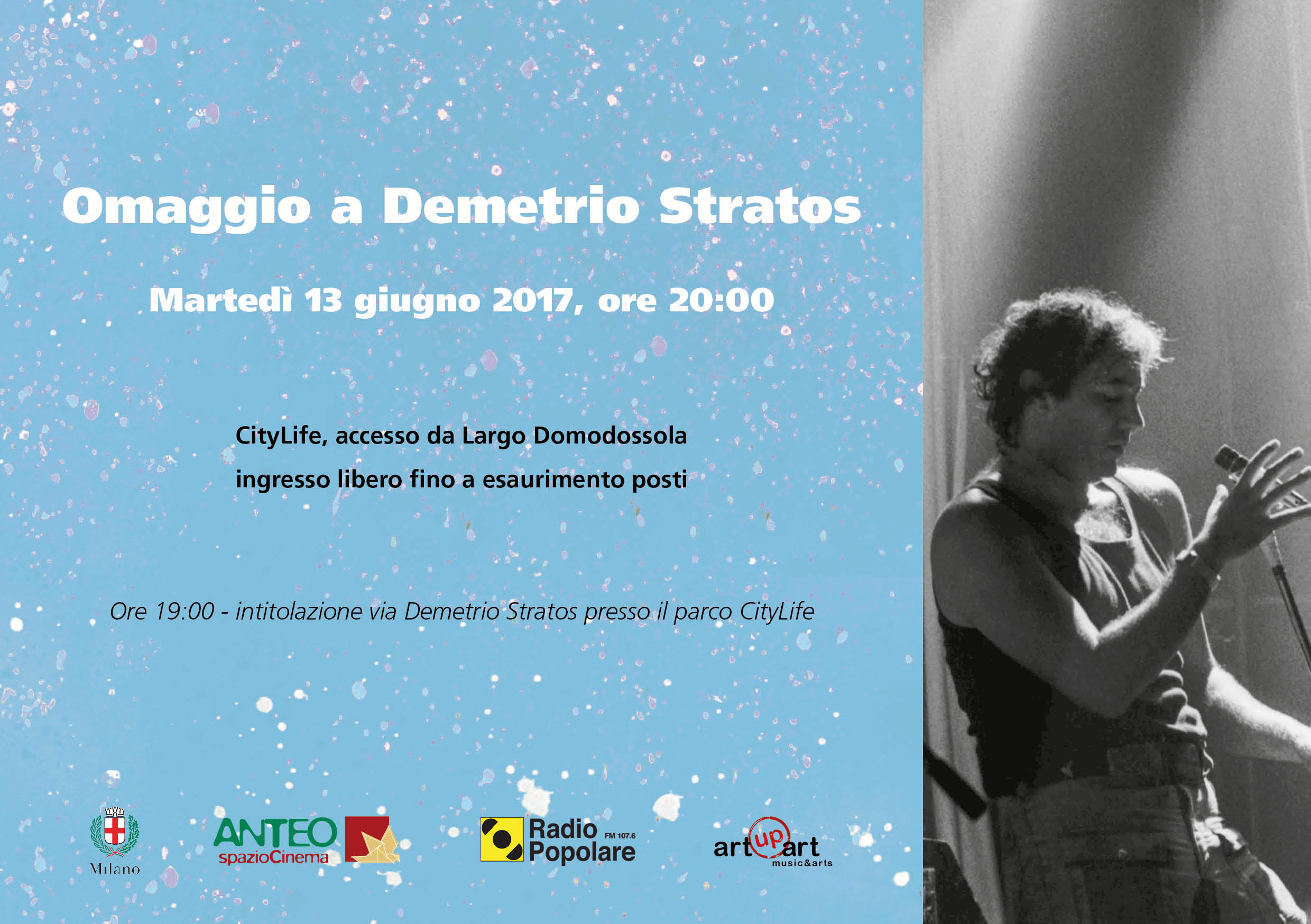 La cerimonia di intitolazione avverrà alle ore 19.00 nell’area City Life presso via Elsa Morante. Alle 20.00 l’omaggio a Demetrio: musicisti, artisti e amici lo ricorderanno presso lo spazio Arianteo di City Life (entrata da Largo Domodossola). Ingresso gratuito fino ad esaurimento posti (circa 600 posti); l’evento sarà in diretta su Radio Popolare, moderato da Claudio Agostoni. Tra i numerosi ospiti invitati (pensiamo a Eugenio Finardi, Mauro Pagani, Carlo Boccadoro, Gaetano Liguori, Ricky Gianco, Roberto Masotti, Fabio Treves e ovviamente gli Area e Daniela Ronconi Stratos) ci saranno anche Enrico Merlin e Valerio Scrignoli: i due chitarristi sono stati invitati a suonare un brano degli Area tratto dal recente album Maledetti (prodotto da Musicamorfosi), un’operazione originale e sorprendente di rilettura del patrimonio della storica band a opera di due chitarre elettriche. Alle 21.45, proiezione del film documentario La Voce Stratos.