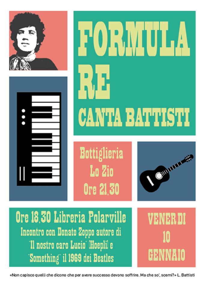 Cantava così Lucio Battisti in Registrazione, e la lettera B sarà al centro di una tre giorni – anzi tre sere… – abruzzese: avrò l’onore di raccontare Beatles e Battisti, e di presentare i miei ultimi due libri a loro dedicati, dal 9 all’11 gennaio. In compagnia del sottoscritto Paolo Tocco, Fabio Ciminiera e i Formula RE.