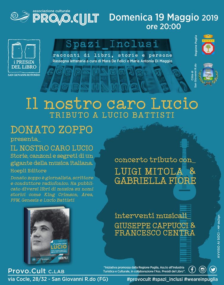 Domenica 19 maggio 2019 Donato Zoppo presenta al Provo Cult di S. Giovanni Rotondo (FG) il libro Il nostro caro Lucio – Storia, canzoni e segreti di un gigante della musica italiana, pubblicato da Hoepli in occasione del ventennale della scomparsa del grande musicista. Il volume celebra Battisti con curiosità, interviste e testimonianze di coloro che sono gli stati vicini: è il primo titolo della nuova collana Hoepli Storia della canzone italiana – I protagonisti, curata da Ezio Guaitamacchi e dedicata ai grandi della nostra musica leggera. L’incontro è nel cartellone del progetto spazi Inclusi, con l’autore dialogherà la giornalista Maria Antonia Di Maggio, interventi musicali a cura di Giuseppe Cappucci & Francesco Centra, concerto tributo con Luigi Mitola e Gabriella Fiore.