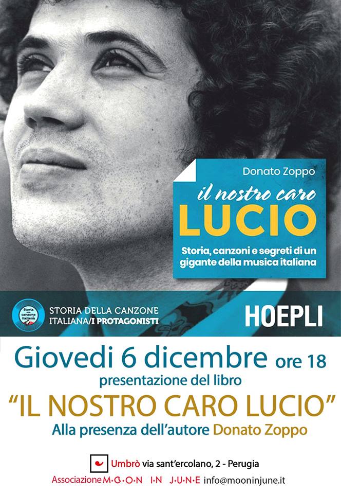Giovedì 6 dicembre 2018 Donato Zoppo presenta a Perugia – Umbrò, via S. Ercolano 2 – il suo nuovo libro Il nostro caro Lucio – Storia, canzoni e segreti di un gigante della musica italiana, pubblicato da Hoepli in occasione del ventennale della scomparsa del grande musicista. Il volume celebra Battisti con curiosità, interviste e testimonianze di coloro che sono gli stati vicini: il testo dell’autore campano è il primo titolo della nuova collana Hoepli Storia della canzone italiana – I protagonisti, curata da Ezio Guaitamacchi e dedicata ai grandi della nostra musica leggera. Moderano la conversazione Riccardo Regi e Leonardo Malà, l’incontro fa da apripista per un importante evento musicale battistiano che si terrà a Perugia il prossimo 12 dicembre.