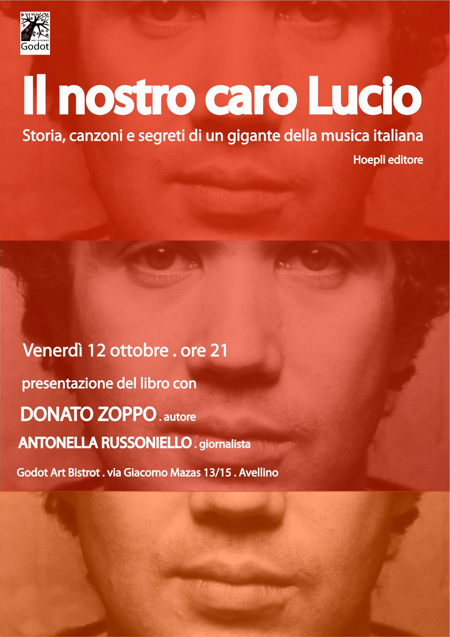 Venerdì 12 ottobre 2018, Donato Zoppo torna ad Avellino con la presentazione del suo nuovissimo libro Il nostro caro Lucio – Storia, canzoni e segreti di un gigante della musica italiana, pubblicato da Hoepli in occasione del ventennale della scomparsa di Lucio Battisti. Un volume che celebra il grande musicista attraverso curiosità, interviste, chicche discografiche e testimonianze di coloro che sono gli stati vicini: il testo dell’autore sannita è il primo titolo della nuova collana Hoepli Storia della canzone italiana – I protagonisti, curata da Ezio Guaitamacchi e dedicata ai grandi della nostra musica leggera. Insieme a Zoppo, a video, libri e vinili d’epoca, ci sarà la giornalista Antonella Russoniello, moderatrice dell’incontro al Godot Art Bistrot.