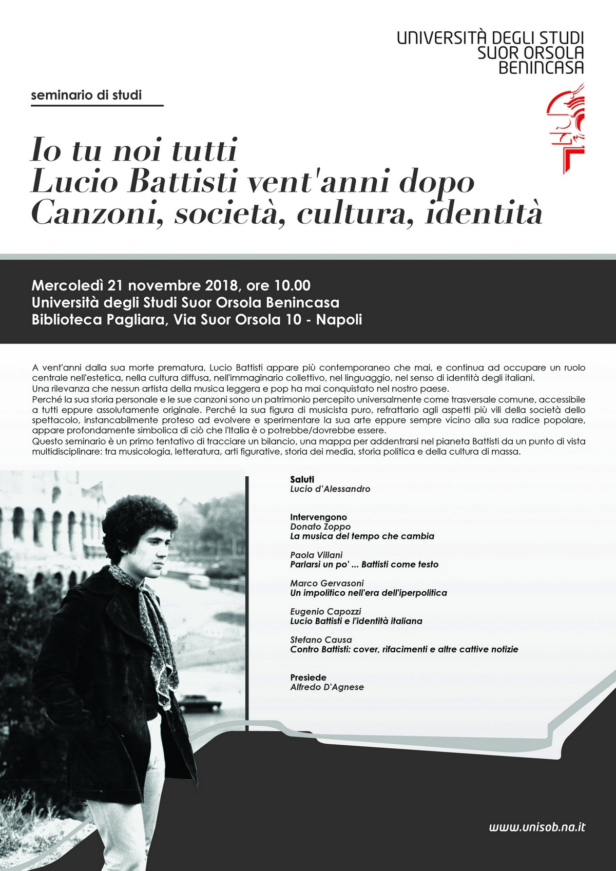 Questo seminario è un primo tentativo di tracciare un bilancio, una mappa per addentrarsi nel pianeta Battisti da un punto di vista multidisciplinare: tra musicologia, letteratura, arti figurative, storia dei media, storia politica e della cultura di massa.