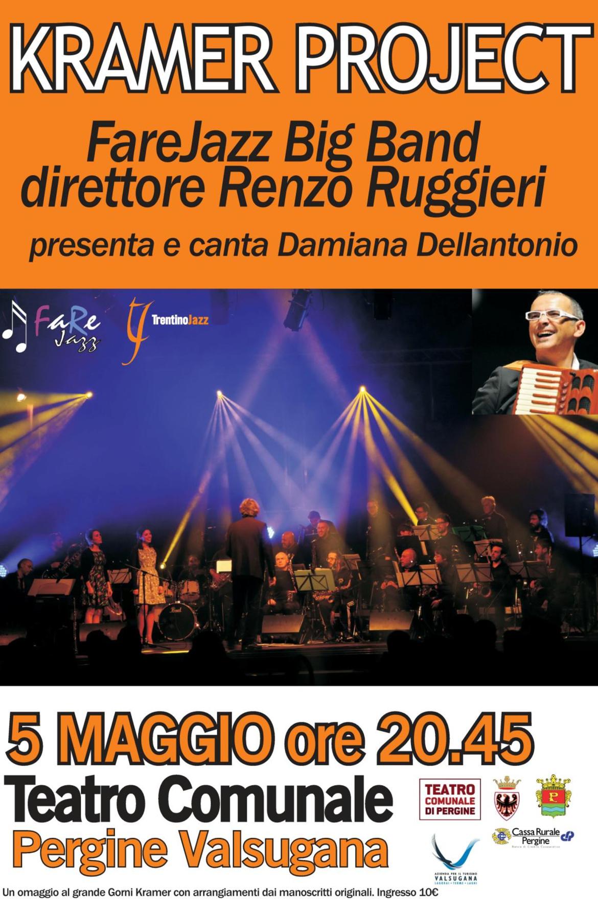 originali combinati a contributi video sulla vita e l’opera del maestro. Il concerto, introdotto dalla storica sigla L’Orchestra del cuore, si alterna alle proiezioni sulla vita di Kramer, sottolineandone tre grandi momenti: gli anni ’30 e’40, le commedie musicali, la TV. Per l’occasione al Valsugana Jazz Tour 2017 – sezione storica del TrentinoInJazz 2017, in procinto di rendere noto l’intero calendario di eventi – la vocalist Damiana Dellantonio presenterà la Band diretta da Ruggieri e si esibirà nei principali pezzi di Kramer. Un appuntamento importante, di respiro nazionale, che inaugura la nuova stagione di concerti del TrentinoInJazz 2017, la rassegna che dal 2012 unisce in una rete una serie di festival prima autonomi nelle valli trentine.