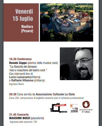 Venerdì 15 luglio 2016 alle 18.30 nel borgo di Novilara, a pochi chilometri dalla città di Pesaro, nel cartellone di Ville e Castella 2016, nuova presentazione di La Filosofia dei Genesis. Voci e maschere del Teatro Rock, il libro di Donato Zoppo, con la partecipazione dell’autore e i contributi musicali del Notturno Concertante. Ville e Castella giunge alla Ventesima edizione: è uno dei festival culturali più originali e suggestivi d’Italia, articolato in una serie di incontri tematici, conferenze, concerti e momenti conviviali nei centri storici più belli della provincia di Pesaro. Alle 20.30, dopo la presentazione del libro, cena servita dall’Associazione Culturale La Stele (cena euro 20, comprensiva di biglietto concerto – non è richiesta prenotazione). Alle 21.45 secondo appuntamento con una rivisitazione prog-rock: Massimo Bucci al pianoforte con il repertorio storico di Genesis, ELP e altri (ingresso solo concerto euro 10).