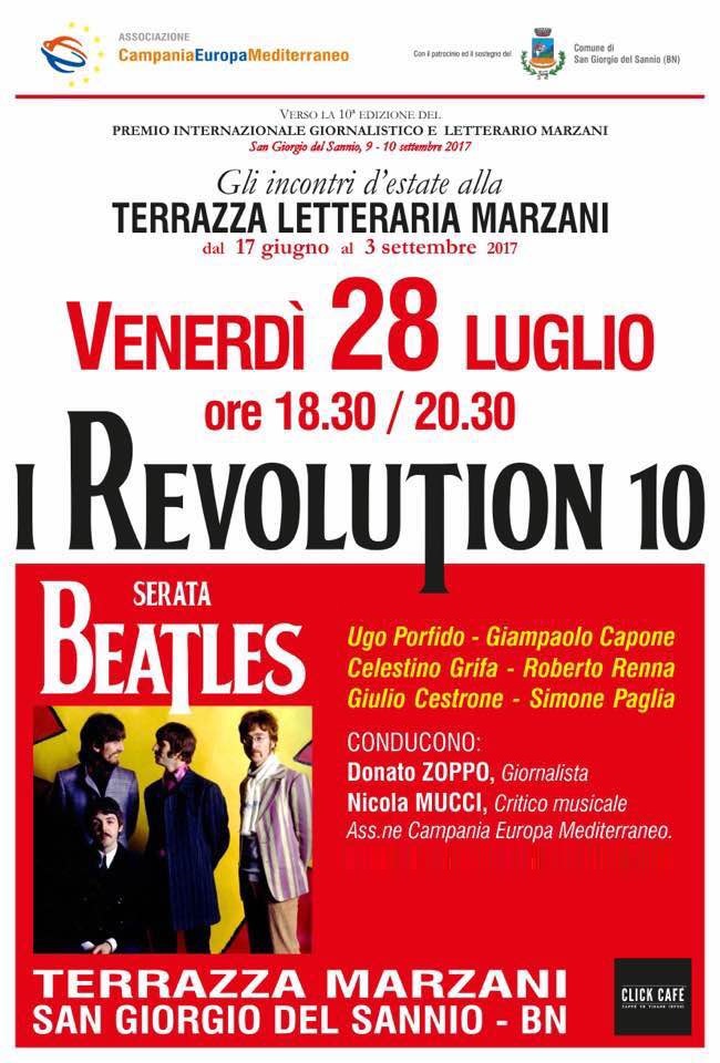 Venerdì 28 luglio 2017 si aprirà la rassegna Terrazza Letteraria Marzani, un ciclo di incontri culturali e artistici che farà da preludio alla X Edizione del Premio Internazionale Letterario e Giornalistico Marzani, in programma il 9 e 10 settembre 2017. Il primo di questi incontri sarà all’insegna della grande musica, con una serata speciale dedicata ai Beatles! Se ne occuperanno i Revolution#10, con la conduzione del giornalista Donato Zoppo e di Nicola Mucci, critico musicale dell’Associazione Campania Europa Mediterraneo.